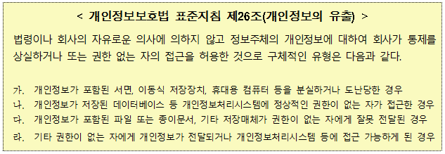 | * | 단 1건만 유출되어도 정보주체에 대한 통지 등 의무 이행 필요 |