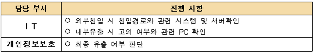 | [1] | 개인정보 유출사고 발생 시 해당사의 유출관련 세부내용 파악, 법률상 의무사항 이행 및 피해확산을 방지 |