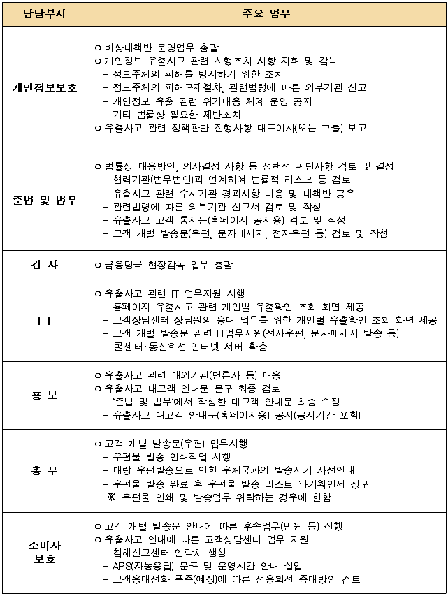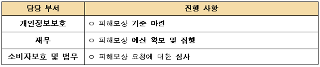 | [1] | 개인정보 유출에 따른 고객 응대 및 민원ㆍ소송 등 분쟁 대응을 위해 피해신고센터를 운영함으로써, 고객 및 회사 피해 최소화 |