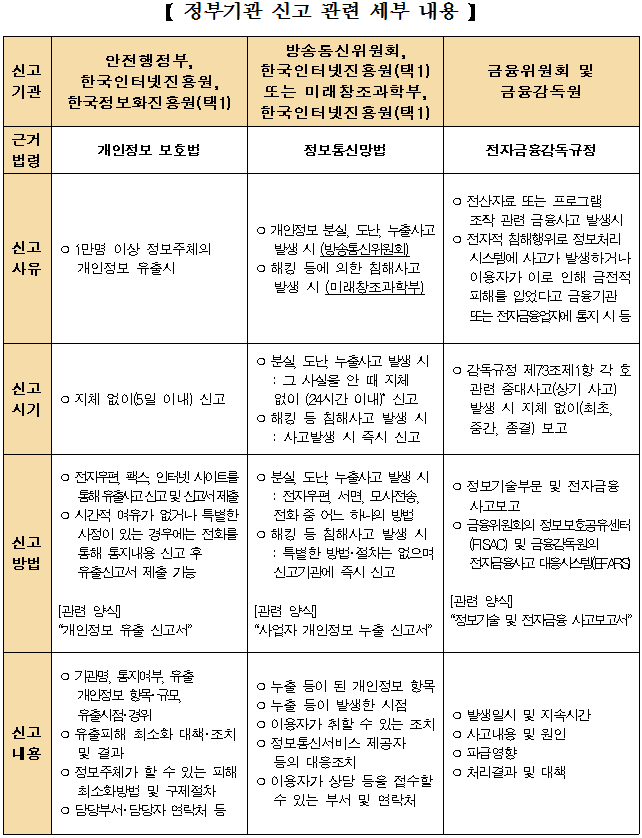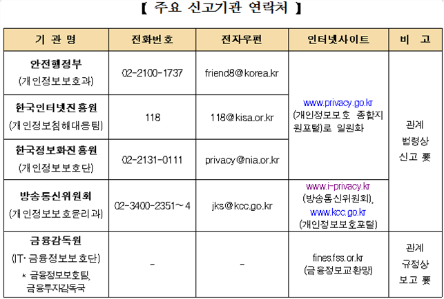 | ○ | 개인정보 유ㆍ누출 시 관계 법령에 따라 정부기관*에 신고해야 함 |