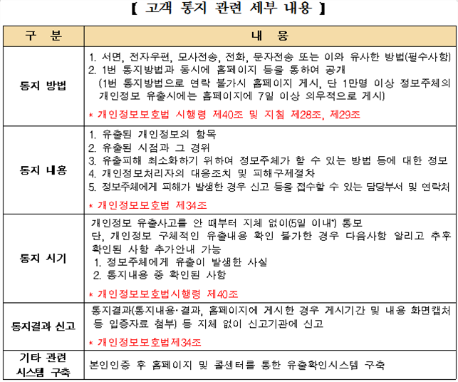 | [1] | 개인정보처리자는개인정보 유출사실을 알게 된 때 지체 없이 정보주체에게 유출관련 내용*을서면, 전자우편, 전화 등의 방법으로 통지 |